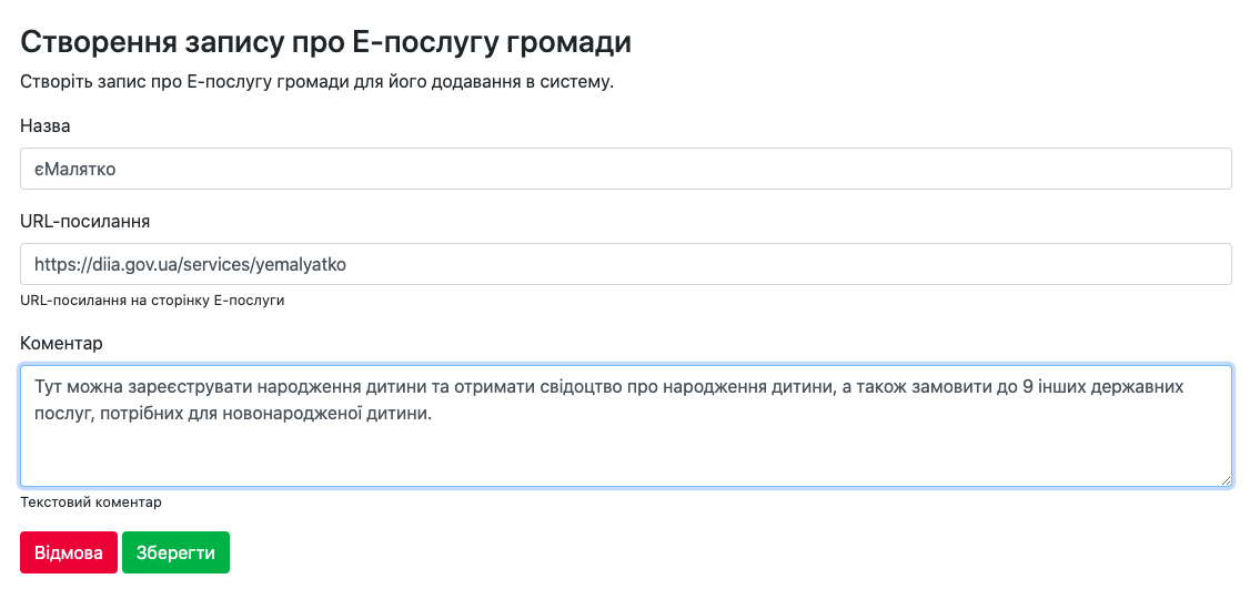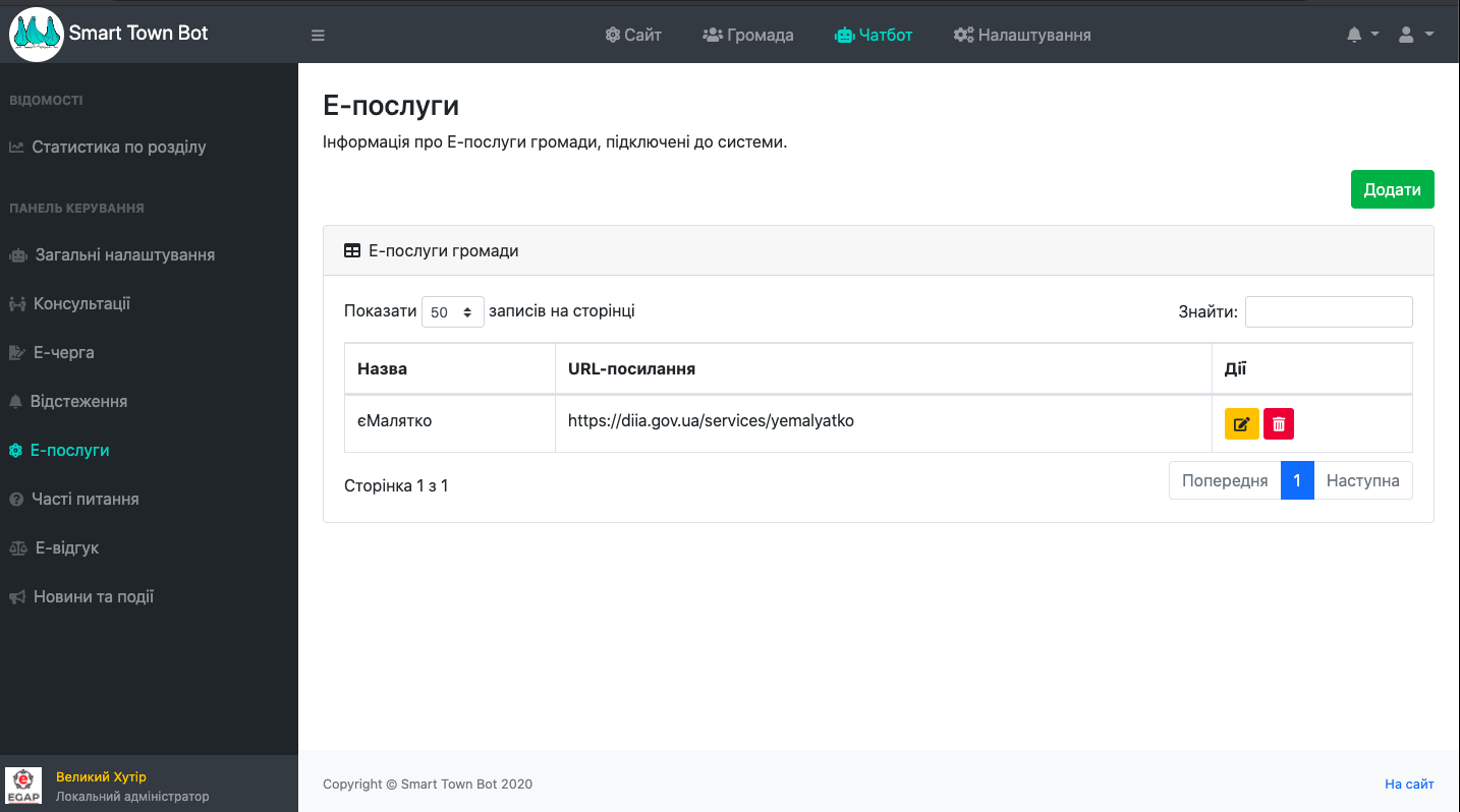 Розділ Е-послуги дозволяє створити прямі посилання (кнопками) з чат-боту на онлайн-сервіси отримання послуг. Для створення кнопки необхідно додати назву послуги, її короткий опис та посилання на онлайн-сервіс.