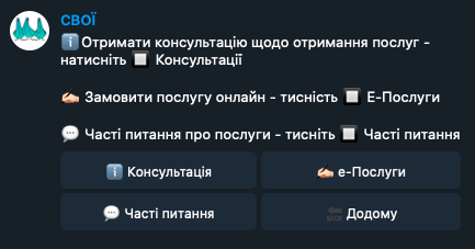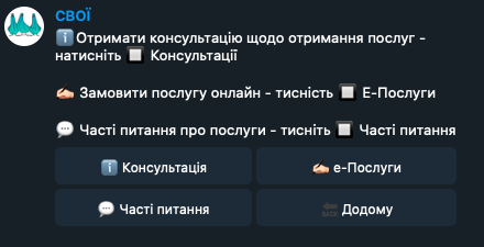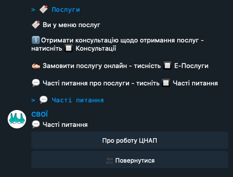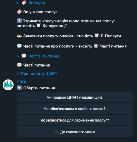 Після створення розділ з частими питаннями відразу стає доступним для перегляду у чат-боті у розділі послуги.