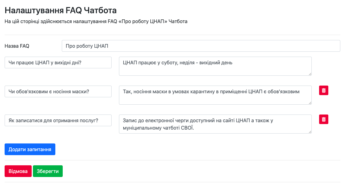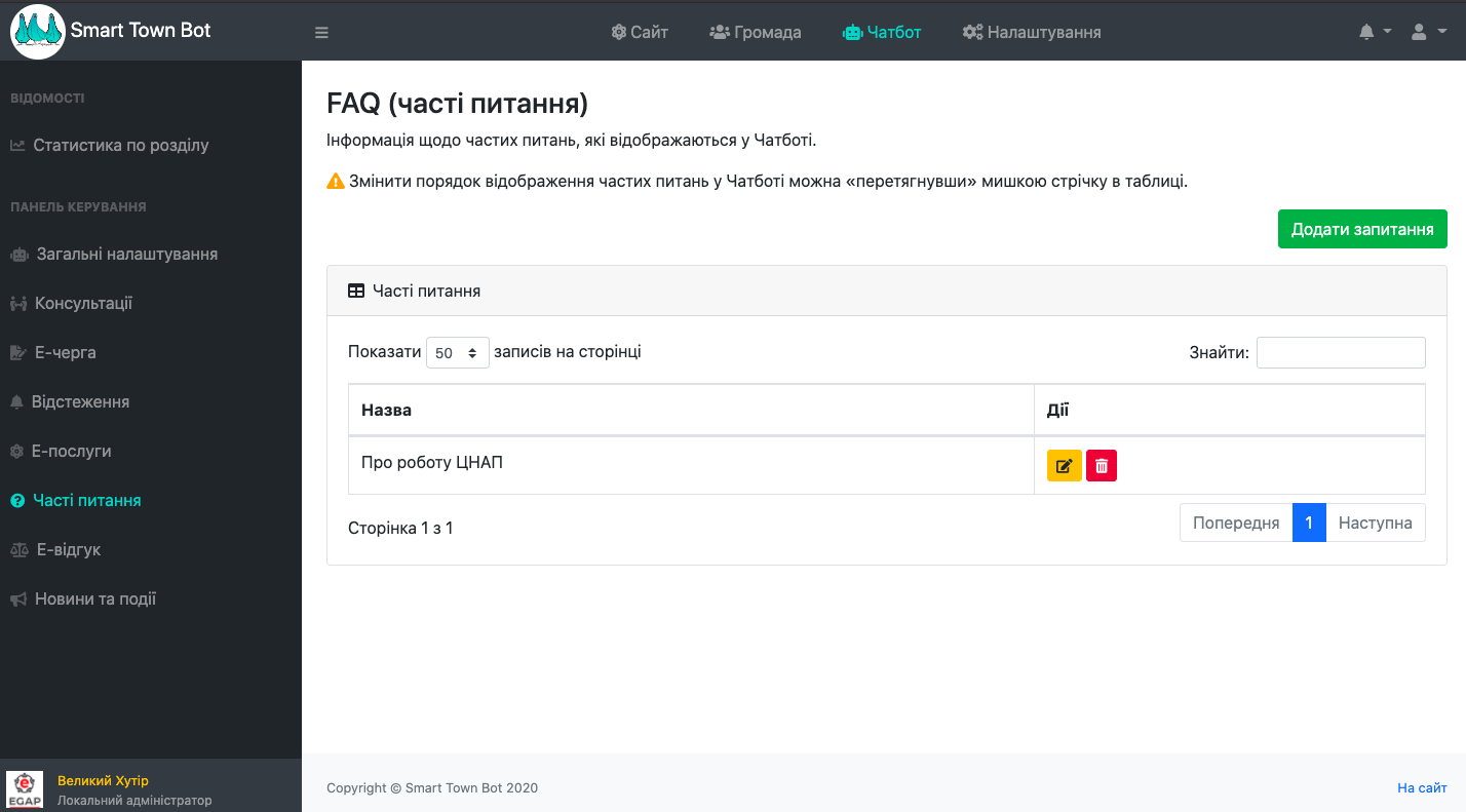 Розділ “Часті питання” дозволяє створити рубрикований розділ простих діалогів (блок питання відповідь складається з однієї кнопки (питання) та одного повідомлення (відповідь)). При цьому Система передбачає можливість створення необмеженої кількості розділів та запитань у кожному з них. У списку відображаються розділи.