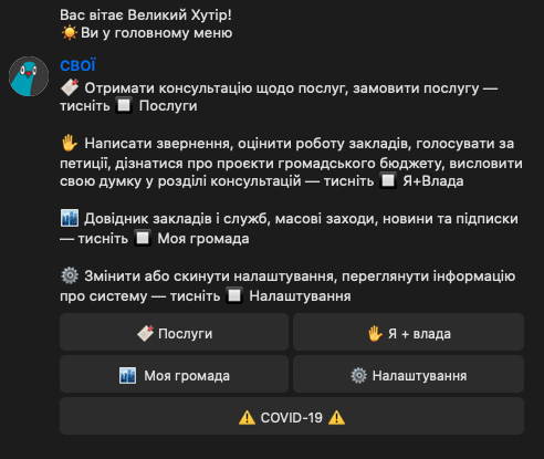 Будь-який створений розділ Частих питань можна додати до головного меню чат-бота. Ця функція допомагає спростити мешканцям доступ до актуальної інформації.