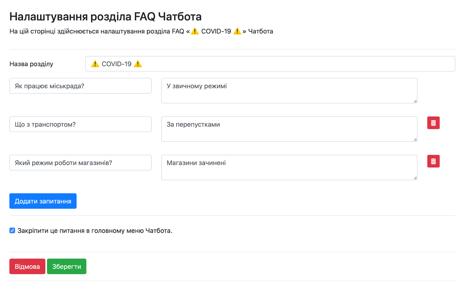 Для додавання розділу до головного меню необхідно в режимі редагування відмітити пункт “Закріпити це питання в головному меню Чатбота”