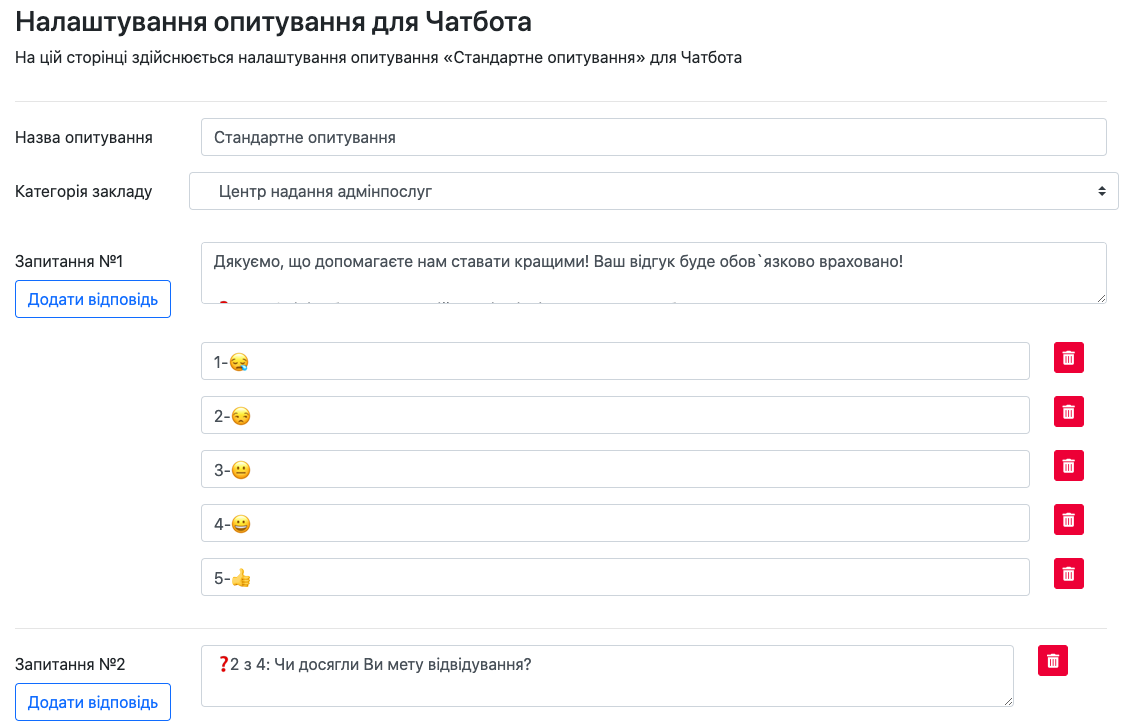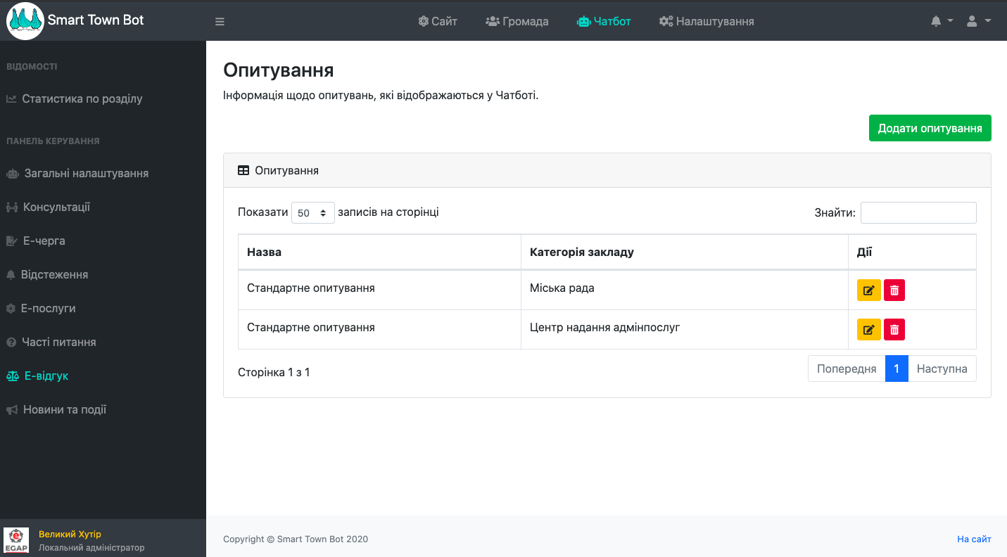 Розділ Е-відгук дозволяє налаштувати діалоги для оцінки користувачами чат-боту якості роботи закладів. Можливість включення закладу до системи оцінювання визначається відповідним полем у властивостях закладу (розділ “Громада”. У випадку підключення до системи оцінювання закладу, Система автоматично створює стандартний діалог оцінювання для категорії закладів, до якої відноситься створений заклад. Стандартний діалог може бути відредагований але залишається єдиним для всіх закладів однієї категорії.