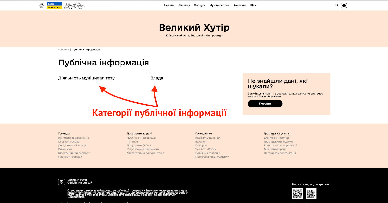 Сторінка на сайті громади із переліком публічної інформації, внесених через розділ “Публічна інформація” генерується автоматично та розміщується за адресою адреса_вашого_сайту/pub-info та складається з двох блоків: