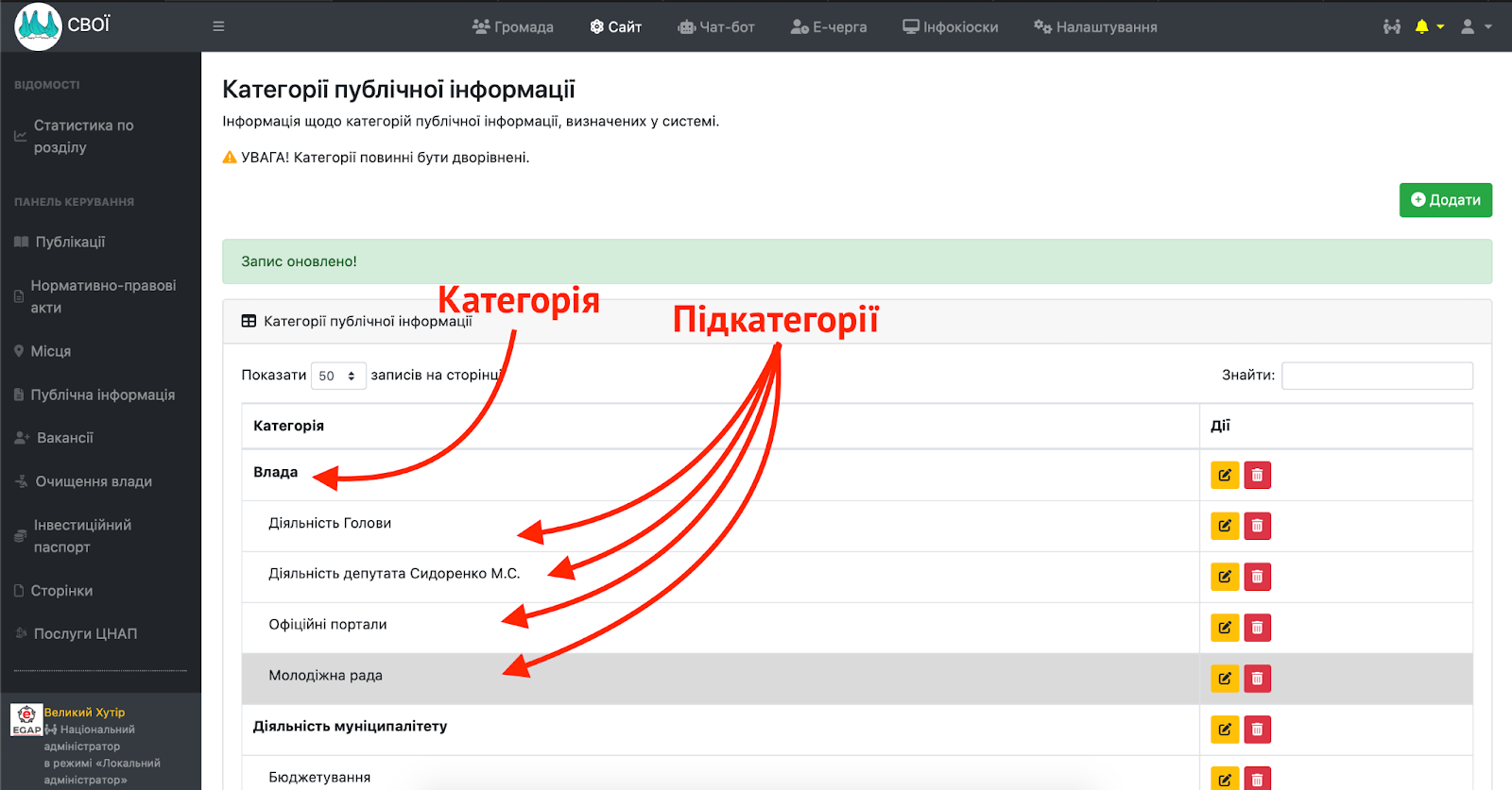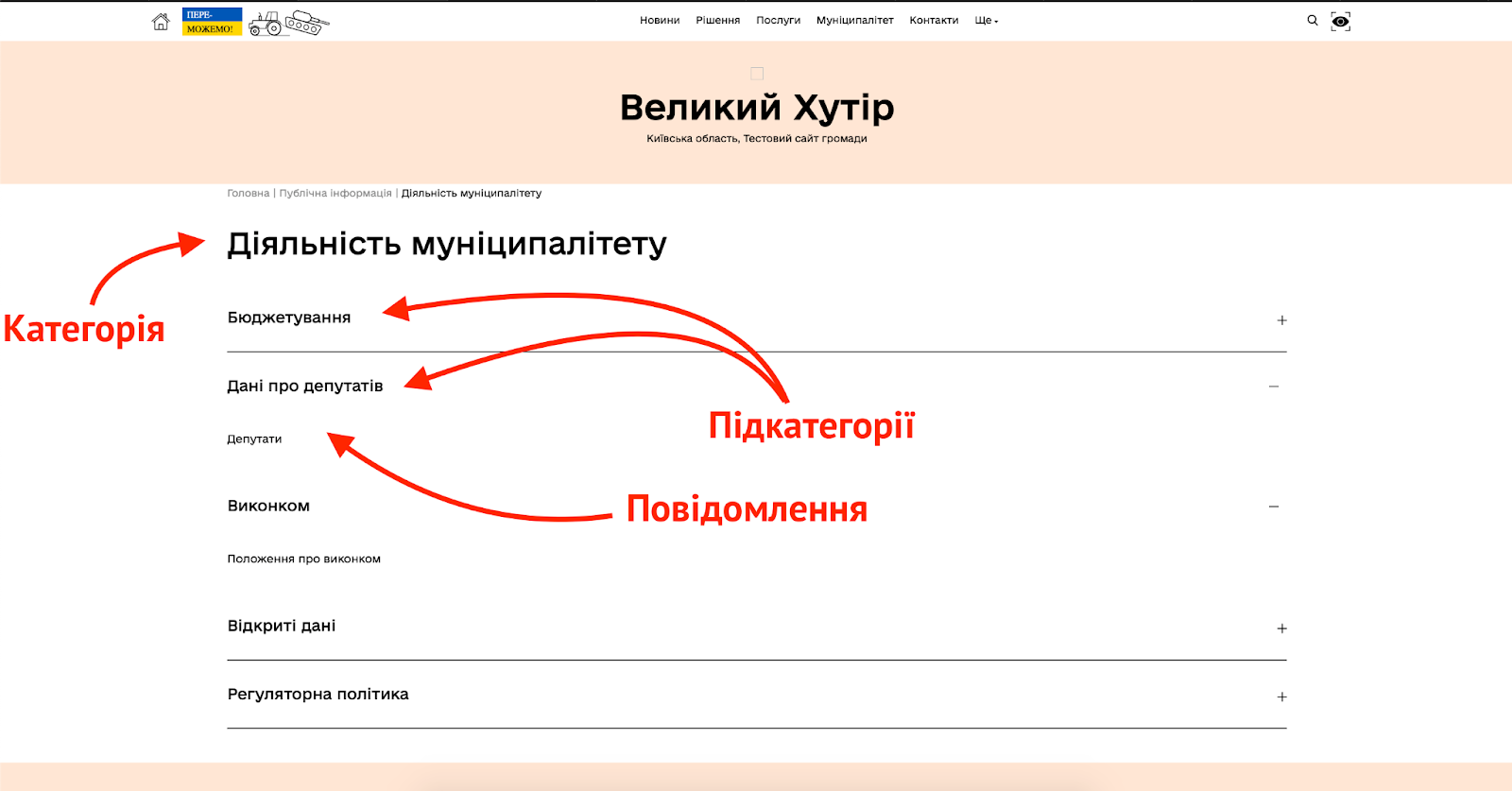 Увага! На сайті громади сторінка “Публічна інформація” має наступну ієрархію “категорія публічної інформації > підкатегорія публічної інформації > повідомлення публічної інформації”.