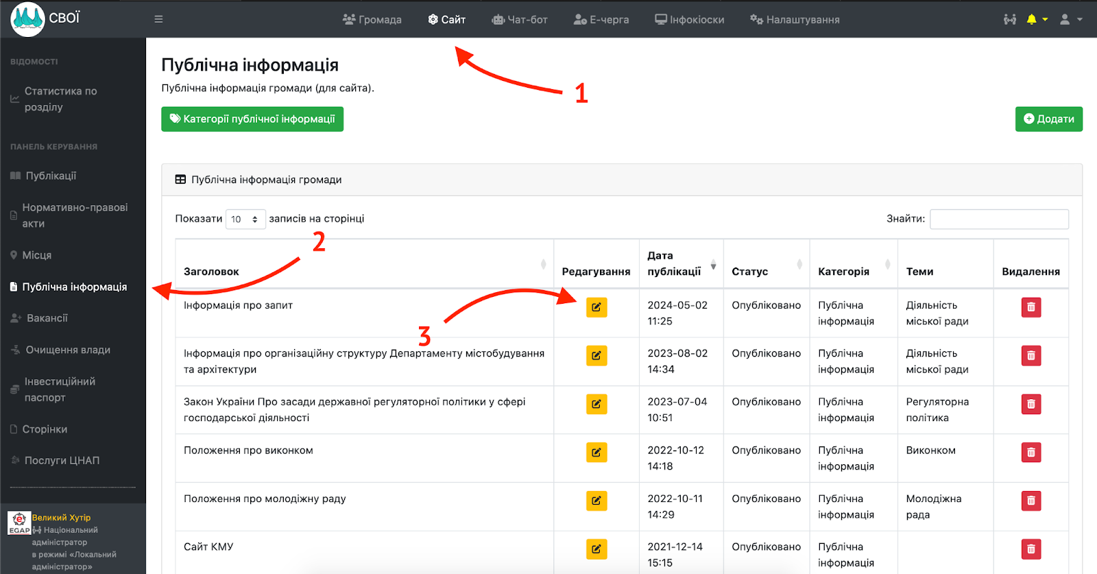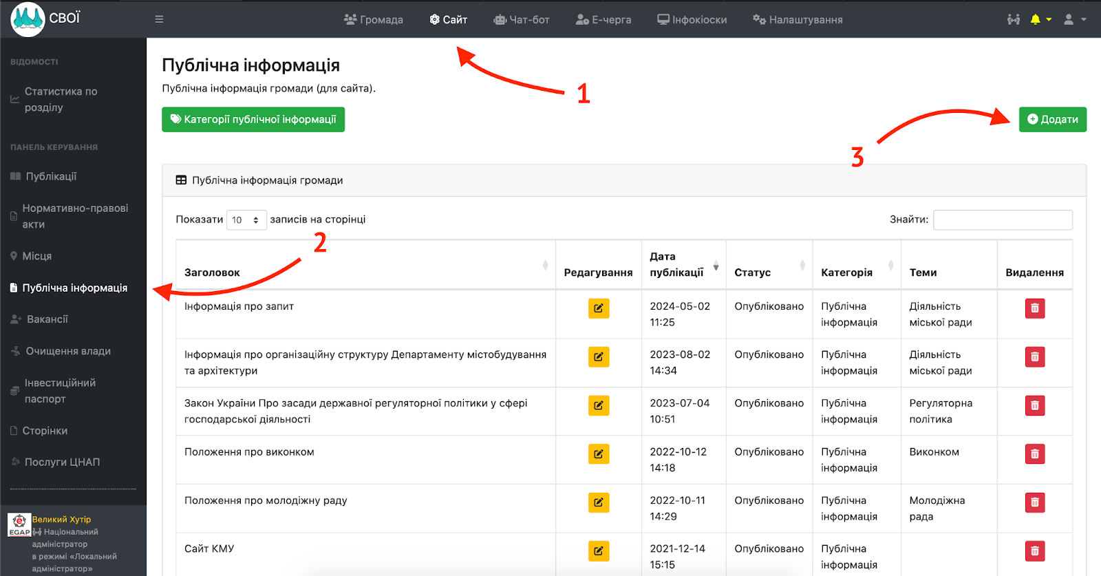 Для цього в адміністративній панелі потрібно увійти в розділ “Сайт”, обрати вкладку “Публічна інформація” на панелі зліва та натиснути кнопку “Категорії публічної інформації”, після чого ви потрапите на відповідну сторінку, де ви можете створювати нові, редагувати та видаляти вже існуючі категорії та підкатегорії публічної інформації.