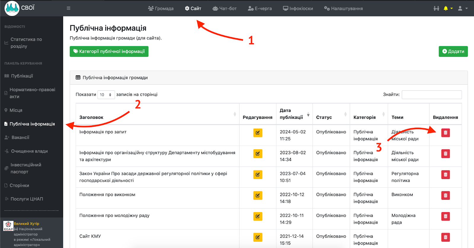 Щоб видалити вже створене повідомлення в адміністративній панелі потрібно увійти в розділ “Сайт”, обрати вкладку “Публічна інформація” на панелі зліва та натиснути кнопку видаленнянавпроти потрібного повідомлення із переліку створених