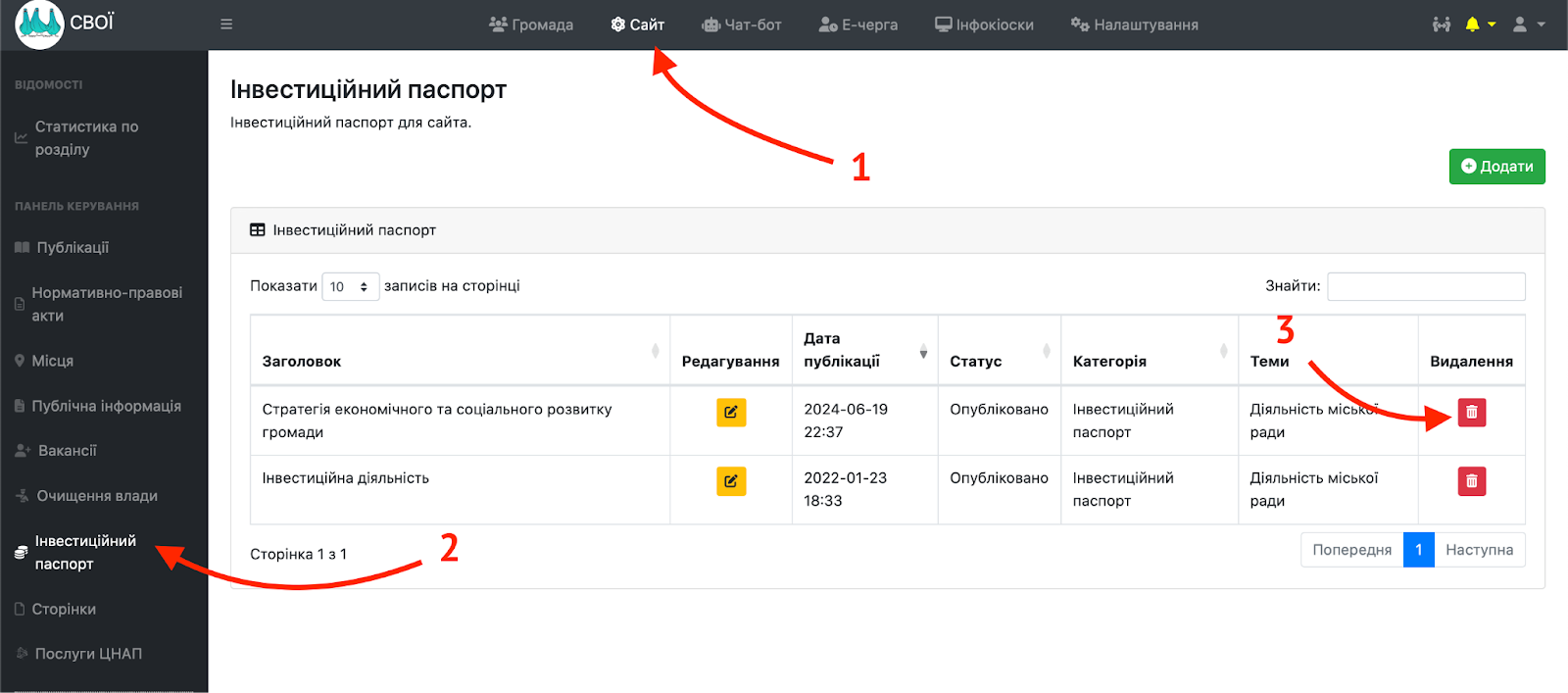 Щоб видалити раніше додану в розділ “Інвестиційний паспорт” інформацію в адміністративній панелі потрібно увійти в розділ “Сайт”, обрати вкладку “Інвестиційний паспорт” на панелі зліва та натиснути кнопку видаленнянавпроти потрібної публікації з переліку раніше доданих.