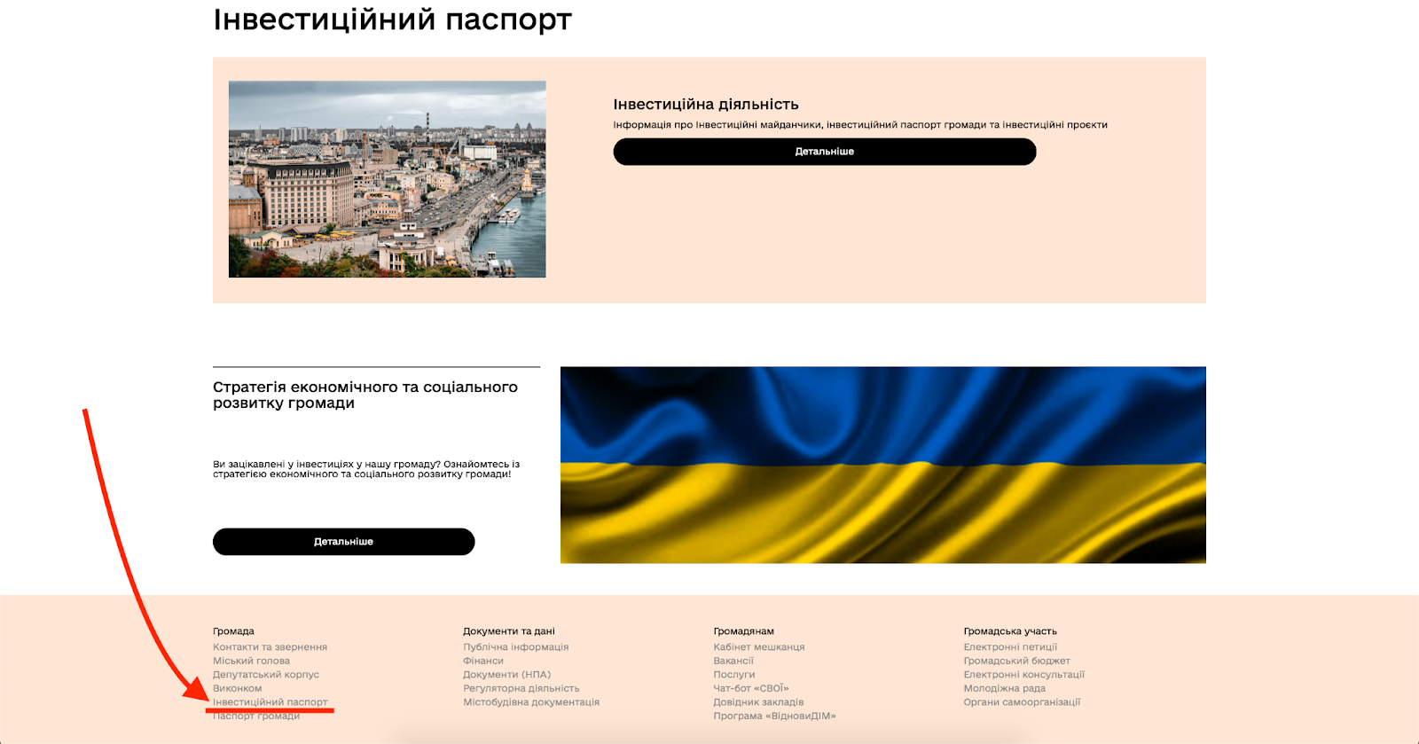 Сторінка на сайті громади із інформацією, внесеною через розділ “Інвестиційний паспорт” генерується автоматично та розміщується за адресою адреса_вашого_сайту/investition-passport і доступна у нижньому навігаційному меню
