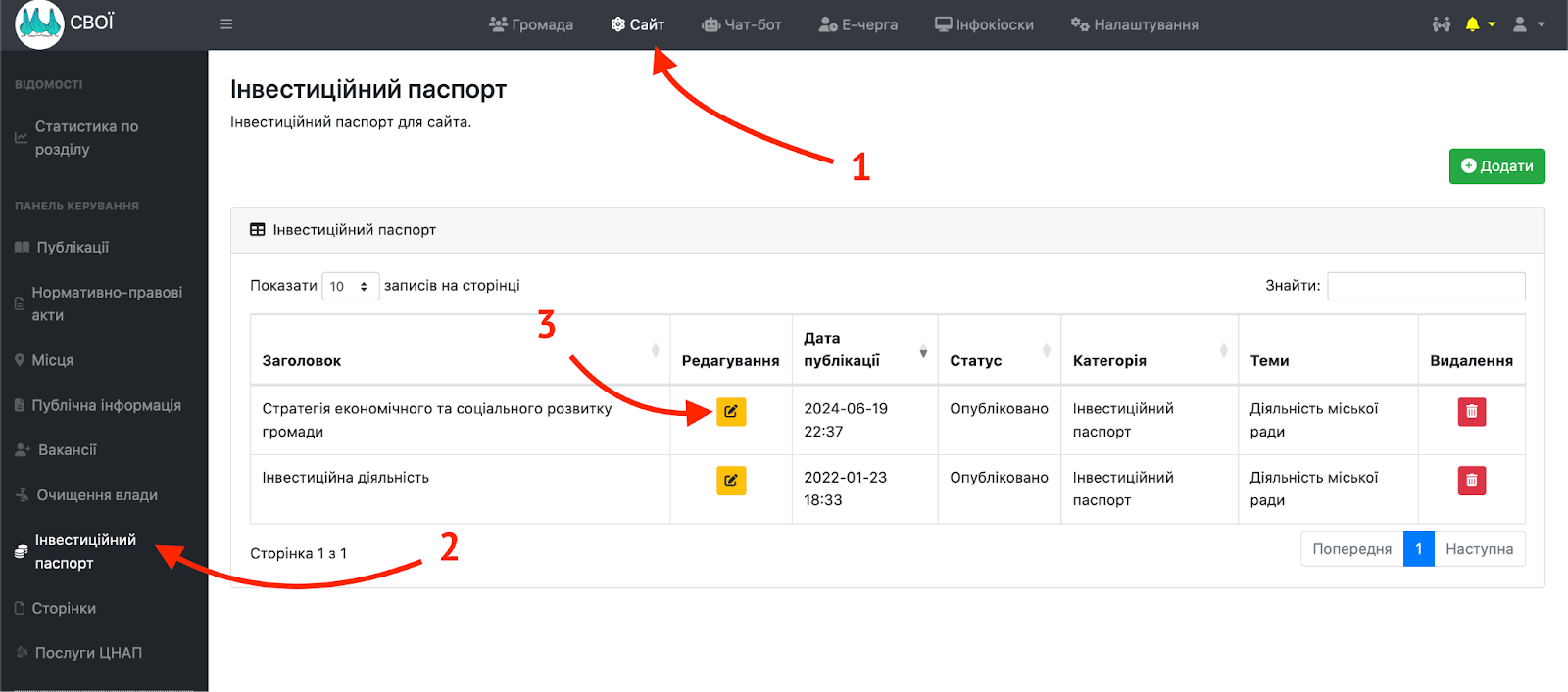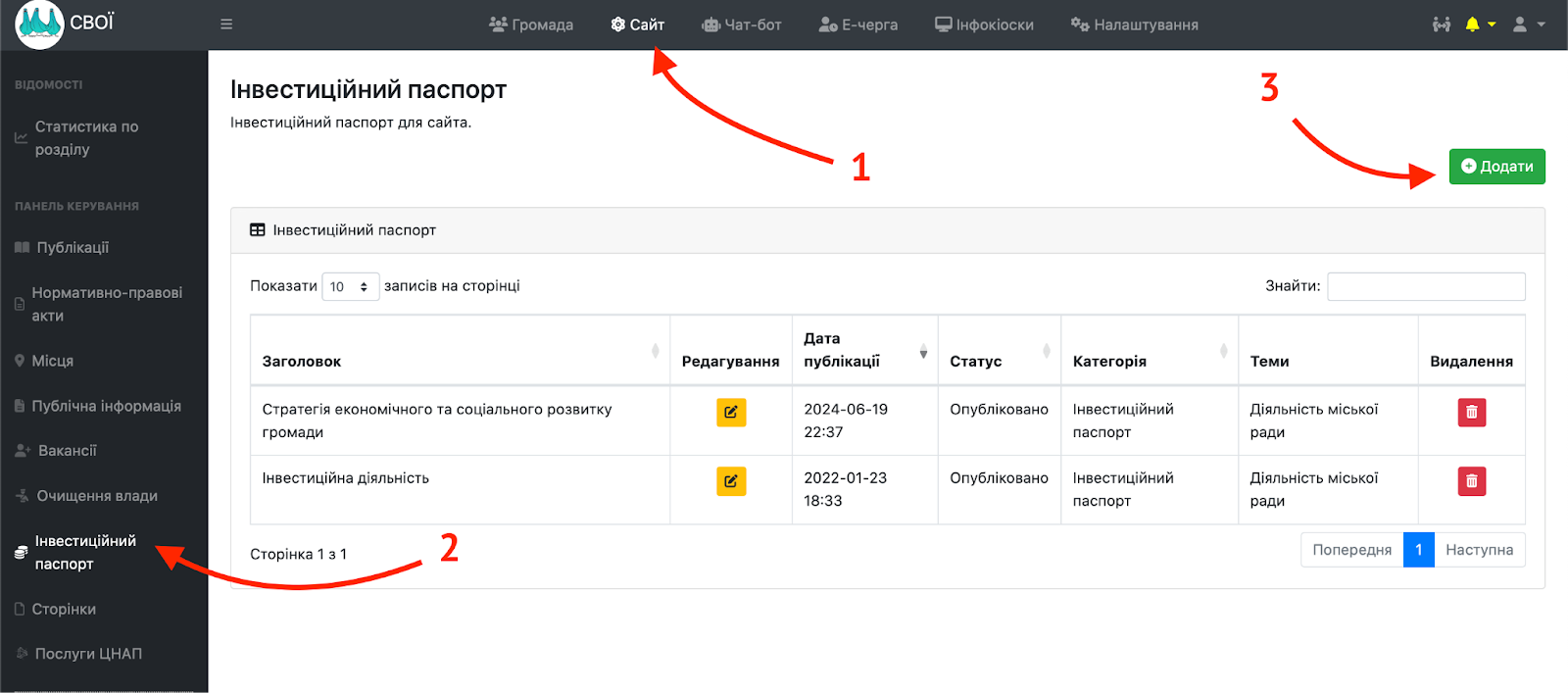 Щоб додати інформацію в розділ “Інвестиційний паспорт” в адміністративній панелі потрібно увійти в розділ “Сайт”, обрати вкладку “Інвестаційний паспорт” на панелі зліва та натиснути кнопку “Додати”.