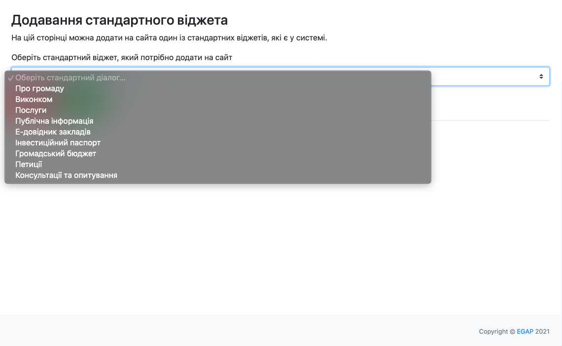 Для додавання стандартного віджета необхідно обрати віджет з випадаючого списку та натиснути кнопку Зберегти.