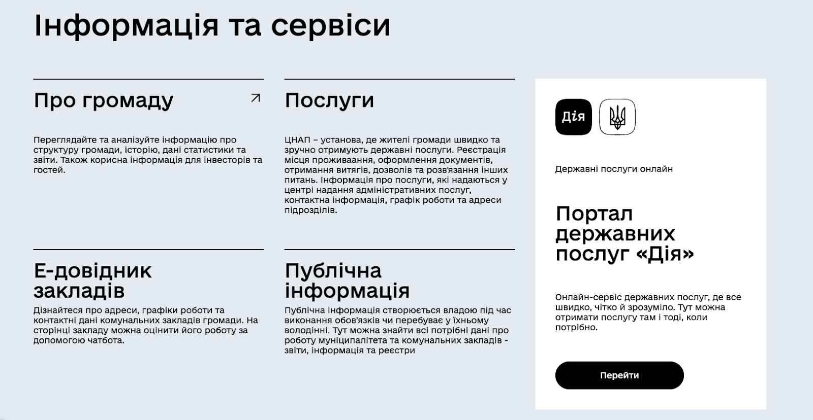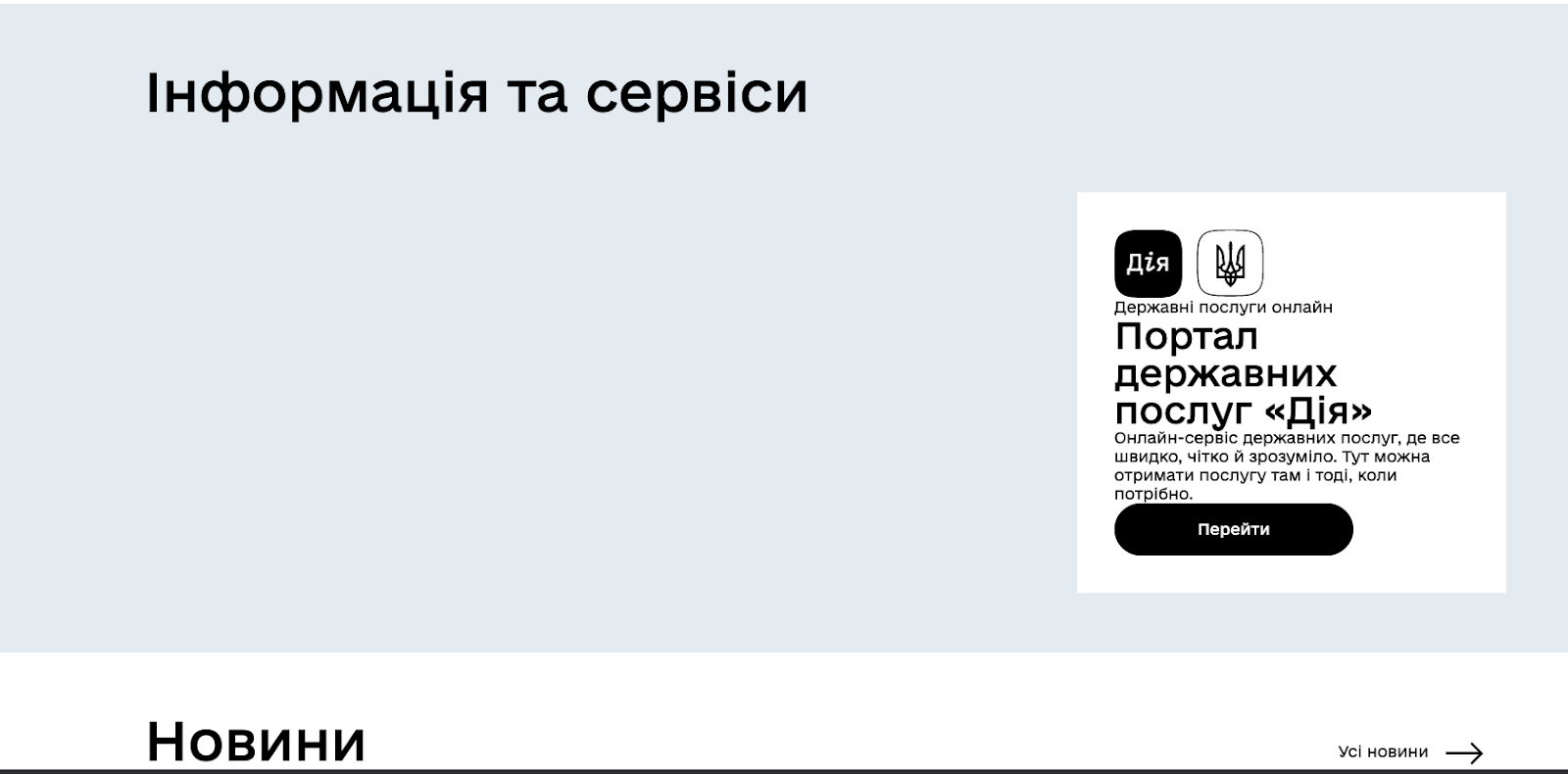 УВАГА! У разі, якщо не додано жодного віджета в блок “Інформація та сервіси”, цей блок не відображатиметься на головній сторінці. Банер Дії відображається лише разом з Блоком “Інформація та сервіси”.