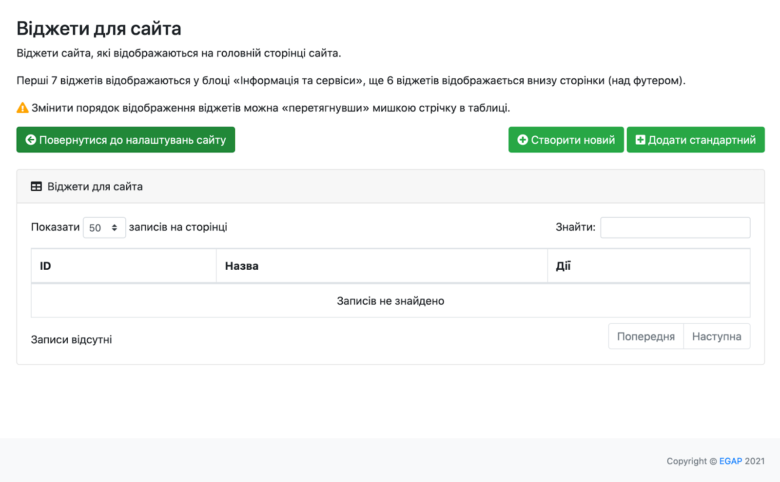 З метою створення можливості швидкого доступу до важливої інформації на сайті, локальний адміністратор може створювати, редагувати, видаляти, а також здійснювати налаштування порядку відображення віджетів у модулі “Інформація та сервіси” на головній сторінці сайту.